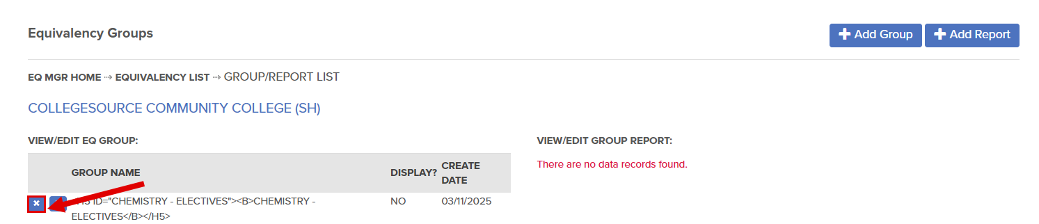 Any previously created Groups or Group Reports will appear on the Equivalency Groups page.