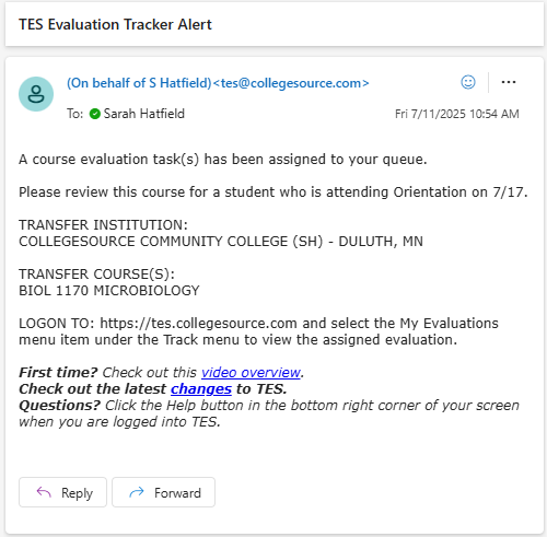 Faculty will generally receive an email alert when an evaluation task has been assigned to the user's queue in TES. This email will include the course(s) needing review, any comments about the evaluation, and instructions for logging into TES to access the evaluation.