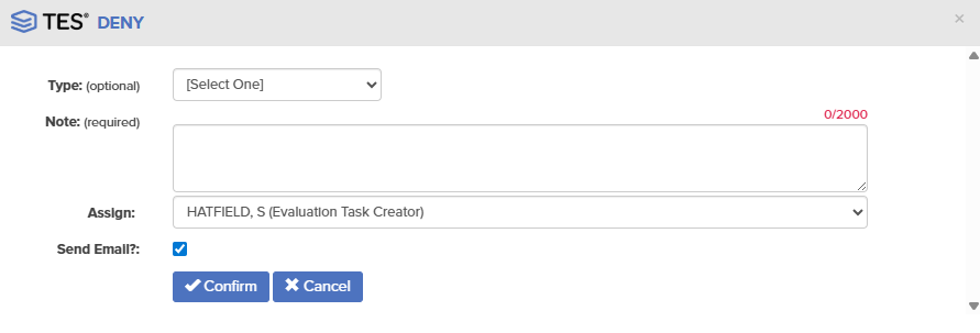 Users can select this option to deny a course. After selecting Deny, you will be asked to choose a reason (Type) for denying the course.