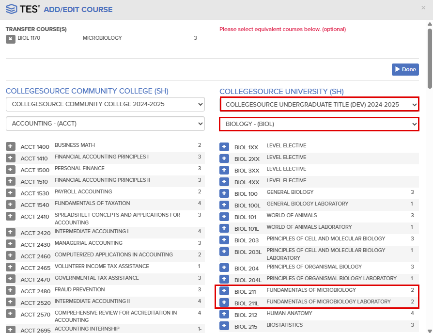 Before selecting this option, consult with your institution's TES Administrator about best practices. If more information is needed to determine if a course is equivalent, the Administrator may recommend transferring the course as a subject-level elective.
