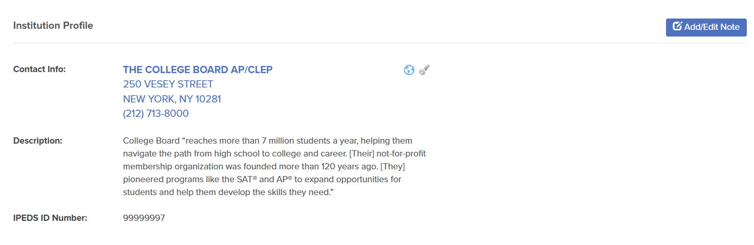 The administration building icon provides access to the Institution Profile information, which includes contact information and a description of the organization. uAchieve® institutions should use the IPEDS ID Number as the SourceID to display equivalencies in Transferology®.